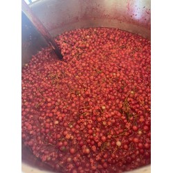 Nous les ramassons, trions et nettoyons avant de les faire cuire et de fabriquer cette superbe gelée que nous sucrons en partie avec du miel de lavande, ce qui permet d'adoucir son acidité naturelle.